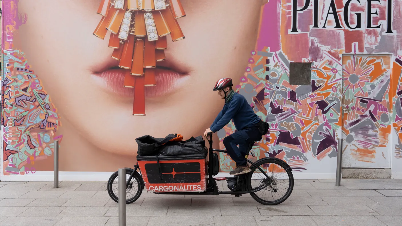 Cargonautes cargo bike rider making deliveries in Paris.